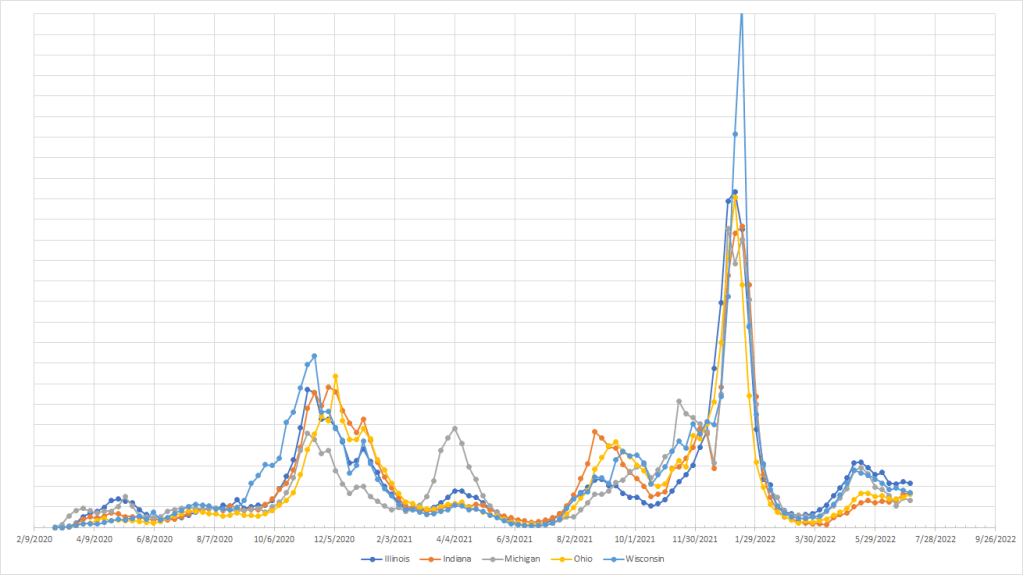 In these three states, the trends are flat to slightly increasing. Kentucky is a little lower than the other two but they are similar. Last year, cases had started to shoot up through July but we aren’t seeing anything close to that level of growth this year.