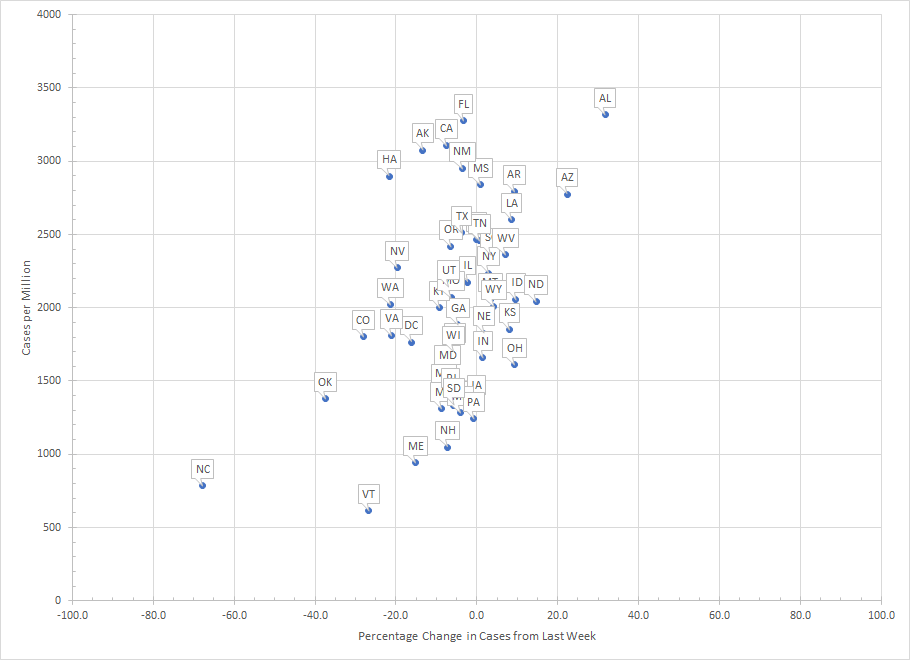 Before we get to the graphs, the data for North Carolina and Oklahoma are a bit suspect due to reporting gaps. So here’s the overall graph showing cases per million vs percentage change in cases.