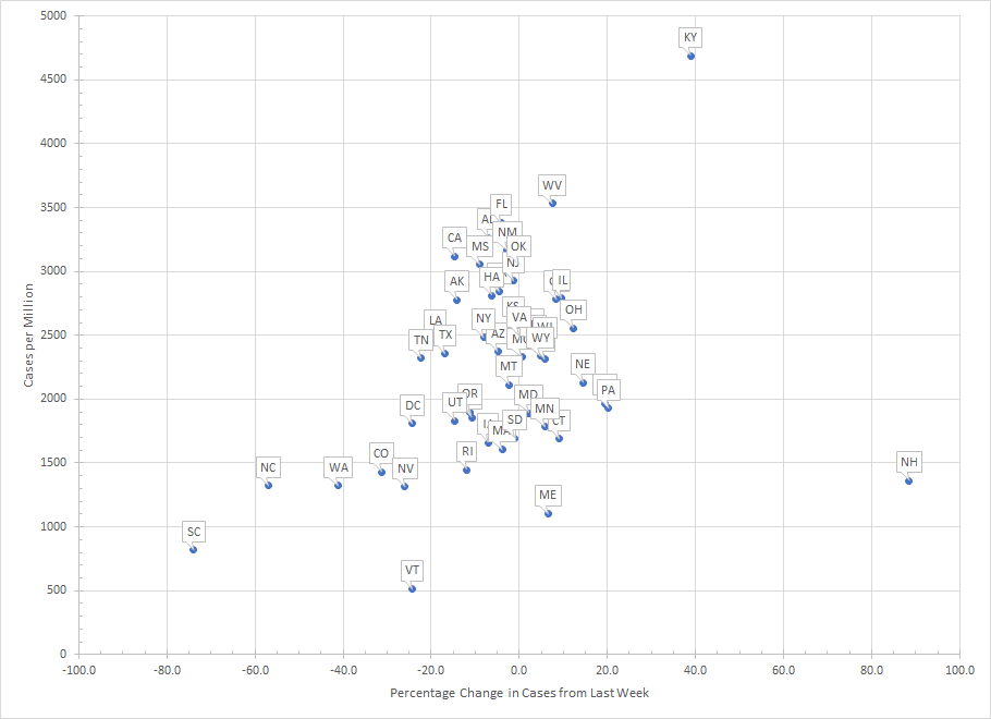 So many of the states seeing large percentage increases or decreases appear to be due to missing data or other reporting anomalies. The bulk of the rest of them are in the -20 to 20% range so not really showing big swings in either direction. The increase in Kentucky appears to be real as every day from this week had more reported cases than the same day last week. Now Kentucky has some other problems to deal with right now so next week’s numbers may show a big decline that may not be real.