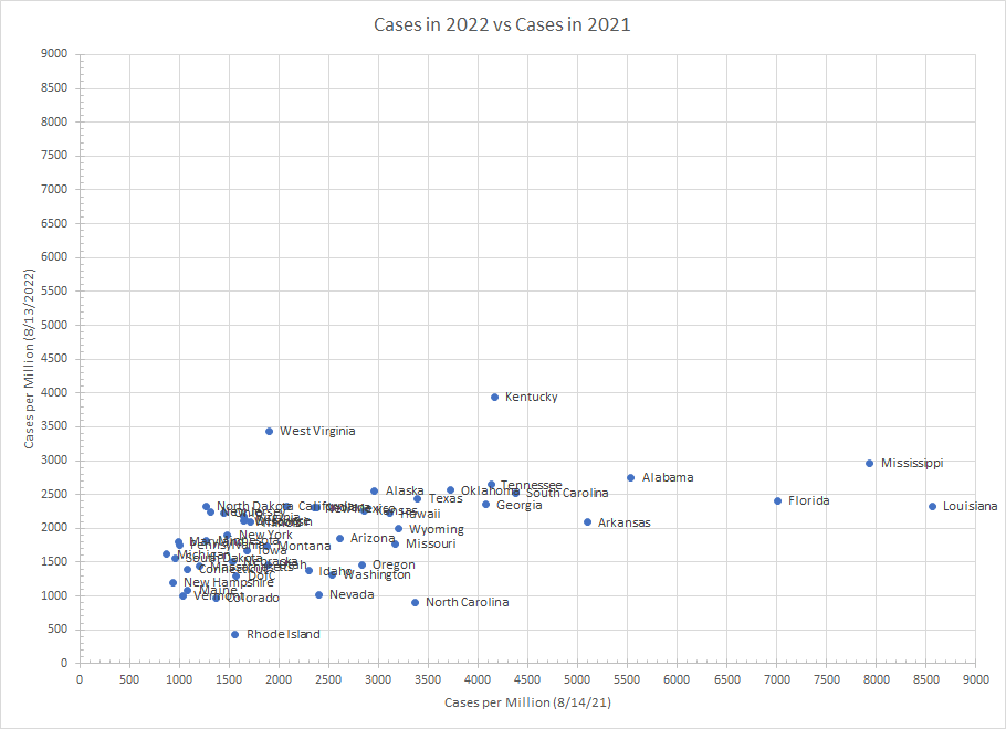 The ten with the highest number of cases per million were Kentucky, West Virginia, Mississippi, Alabama, Tennessee, Oklahoma, Alaska, South Carolina, Texas and Florida. Of those, Kentucky, Mississippi, Alabama, Tennessee, Oklahoma, South Carolina, Texas and Florida were in the top ten for most cases at this time last year as well. I know this point has been made before but I think it helps to keep showing it. Summer is a peak season for COVID in the south.