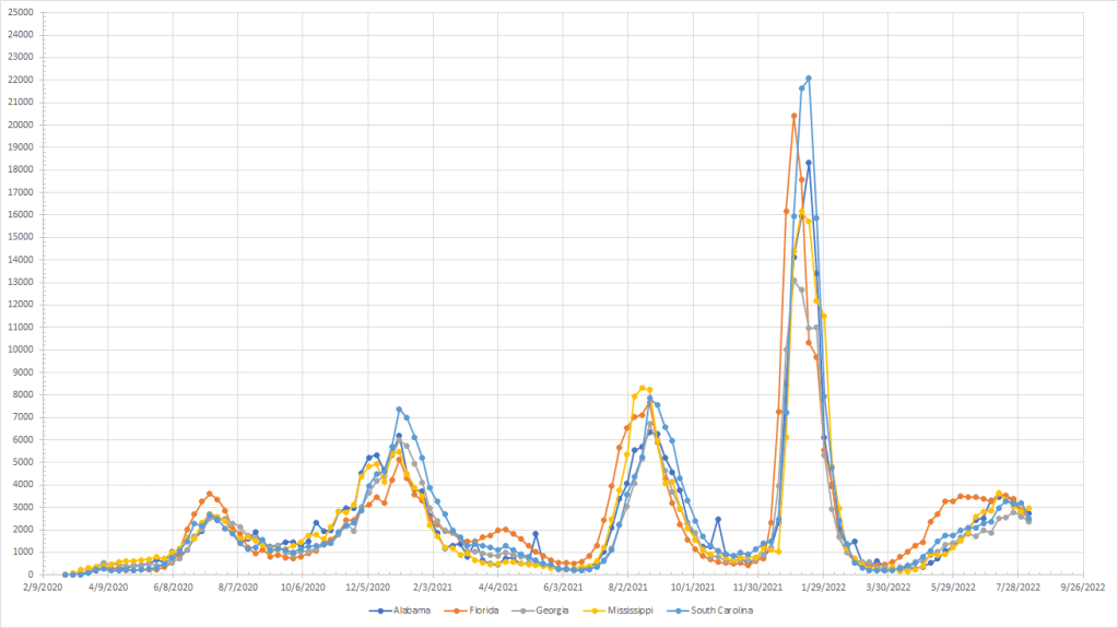 And we continue to see that number of cases in the South this year is well behind what happened there last year. It is worth showing one graph to illustrate this. Last summer, all five states in the Southeast peaked at 6000 or more cases (per million). This year, none of them got above 4000. I don’t have Louisiana on this graph but the story is the same there.