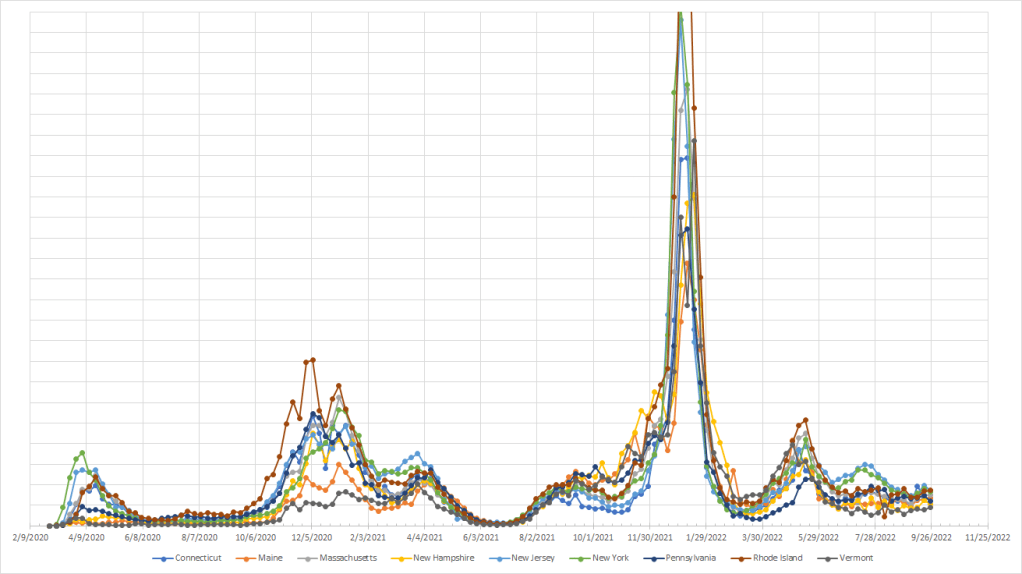 And it might be worth running through the graphs to illustrate this. Starting with the Northeast where cases have basically been flat since June. You can’t really see Maine or Massachusetts so even though the cases are higher than they’ve been recently, they haven’t significantly broken out of this flat range.