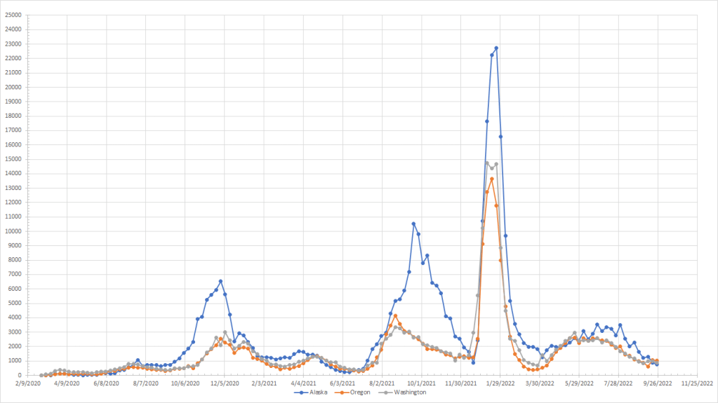 Washington and Oregon continue to mirror each other. Both saw cases rise until May and then they were flat through July and then started dropping. They may be starting to flatten out again because the last couple of weeks the decreases haven’t been as large. Alaska peaked at the end of July and cases have been dropping ever since.