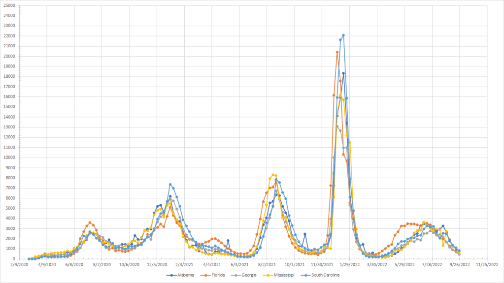 Last year at this time, there were 731,408 newly reported cases as the Delta wave continued its decline. Cases hit a low on October 23rd and then shot back up as we got into winter and the Omicron variant. Right now, we are well below where we were last year so we’ll see what happens as we move through October.