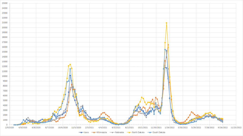 In the upper Midwest, we had a slow gradual increase until roughly late July and then cases have been slowly decreasing since then. They are back to late May levels.