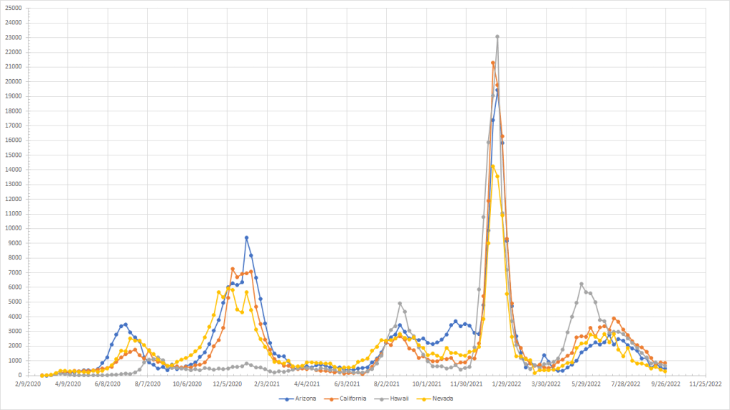 Hawaii peaked in May and the other states in July. Since then, cases have been dropping. At first there was a rapid drop but that seems to have slowed lately. It is possible they are nearing a bottom.
