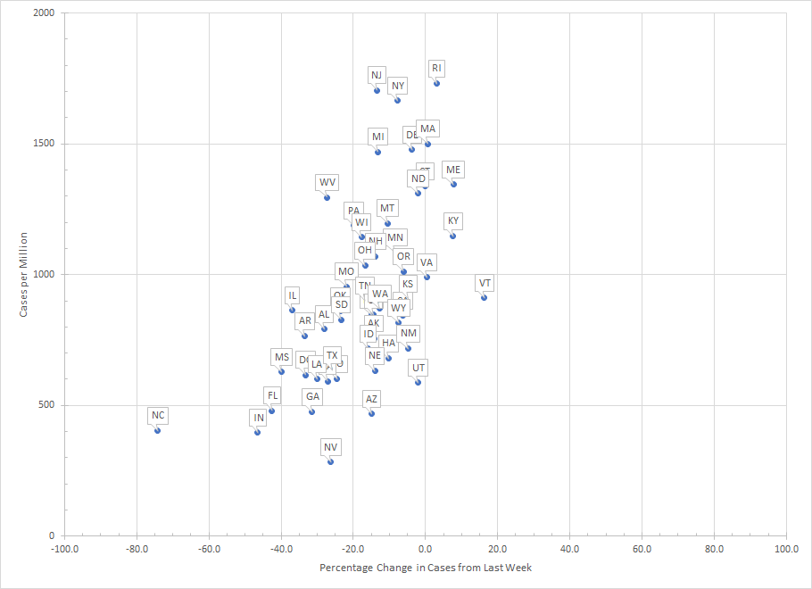 Just to round this out, the states with the most cases (per million) last week were Rhode Island, New Jersey, New York, Massachusetts, Delaware, Michigan, Maine, Connecticut, North Dakota and West Virginia. The list is dominated by the Northeast.